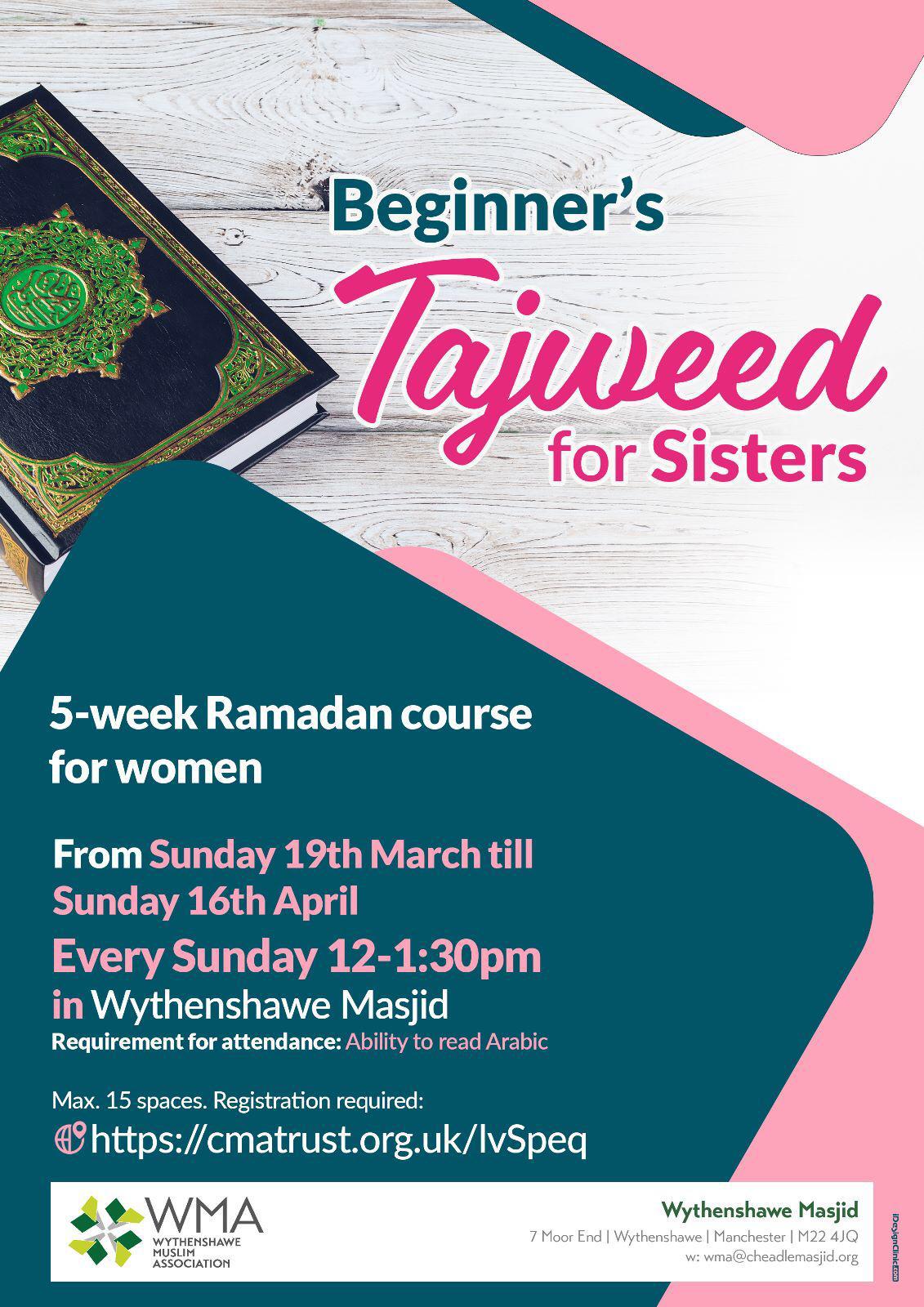 Beginner’s Tajweed for Sisters. A 5-week Ramadan course, taking place every Sunday 12-1:30pm in Wythenshawe Masjid Requirement for attendance: ability to read Arabic. Max. 15 spaces. Registration […]